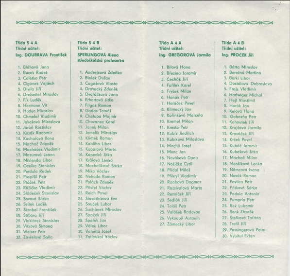 V naší třídě studovalo během 4 let celkem 44 studentů a z tohoto počtu 27 odmaturovalo v roce 1984 v naší škole.Studenti přicházeli a odcházeli(nebo byli odejiti)a z těch 38 co se poprvé viděli v září 1980 odmaturovalo v roce 1984 pouhých 24.